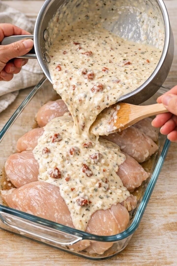 What makes this recipe especially appealing is the effortless “pour-and-bake” method. Instead of preparing multiple components or cooking several pans at once, everything comes together in a single casserole dish. A creamy mixture of heavy cream, Parmesan cheese, garlic, Italian seasoning, and sun-dried tomatoes is whisked together and poured directly over the chicken. As the dish bakes in the oven, the sauce slowly thickens and infuses the chicken with savory flavor, creating tender, juicy meat surrounded by a rich, velvety sauce.